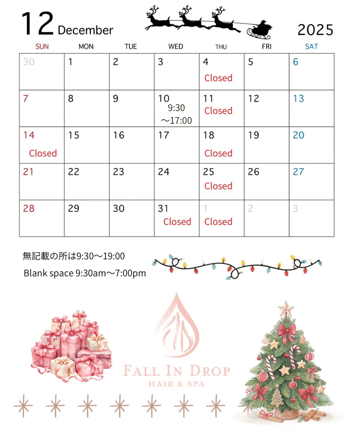 年内は12月30日まで営業しておりますので、ヘアカットやカラー、トリートメントが必要な方は、是非ご来店ください。