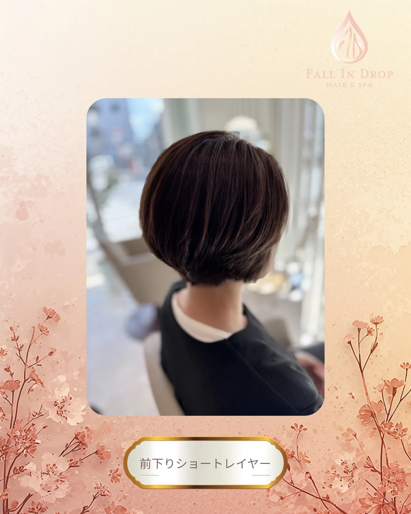 前下がりのショートレイヤースタイルはボリュームラインを前下りにすることで、視覚的に小顔効果を生み出します。